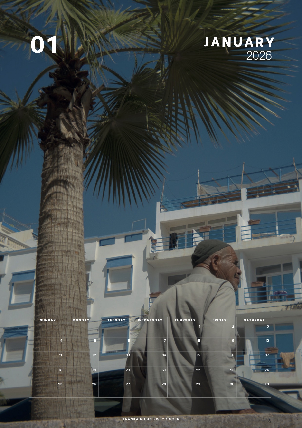 Dieser Kalender entstand während eines spontanen Kurztrips nach Taghazout – einem lebendigen Küstendorf an Marokkos Atlantikküste, das für seine entspannte Surferszene, farbenfrohen Märkte und die warme Atmosphäre bekannt ist.